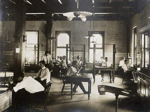 Students conduct experiments in the advanced physics laboratory in F. Edward Hebert Hall circa 1910. At the time of its construction, it was the only laboratory on the south designed exclusively for physics research including little or no iron in its construction (for magnetic reasons), slate slabs for instruments, and piers for instruments that were isolated from the framework of the building.