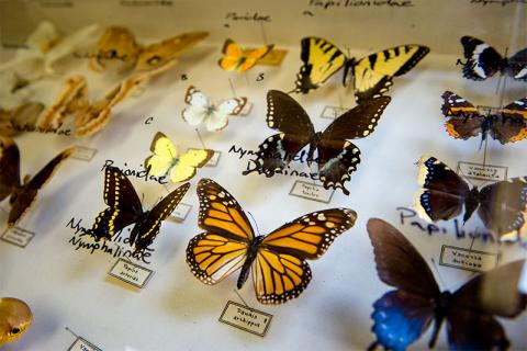 Butterfly specimens are displayed under glass in the Diversity of Life lab on the uptown campus. According to an old wives’ tale, the term butterfly is derived from the belief that the insect stole milk and butter. A more common idea is that the name is based on the yellow or cream colors of many species.