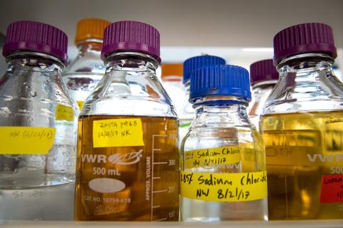 Clear liquids March 20th, 2018 | Paula Burch-Celentano pburch@tulane.edu View PDF Liquid media are stored in the lab of Nicholas Sandoval in the Department of Chemical and Biomolecular Engineering. The liquids contain nutrients to grow bacteria used in a variety of research applications.