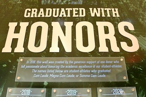 “Student-athletes who receive Latin honors, which are awarded to graduates at the top of their class, are listed on the wall, and they are also given a trophy,” said Charvi Greer, senior associate athletic director for academics.
