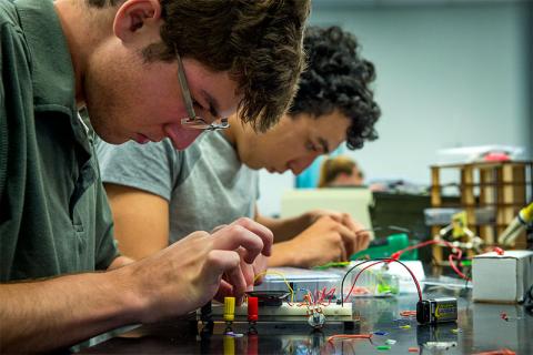 Mason Varuso, a senior at Patrick F. Taylor Science & Technology Academy, focuses on his project for Intro to Electronics, which is part of the Tulane Science Scholars Program for high school students to earn college credit. Other classes include animal behavior, chemical engineering, computer science, neuroscience, psychology, music and technology. In the background is Uriel Icaza, a junior at Brother Martin. Over 90 students are participating in the program with 40 living on campus.
