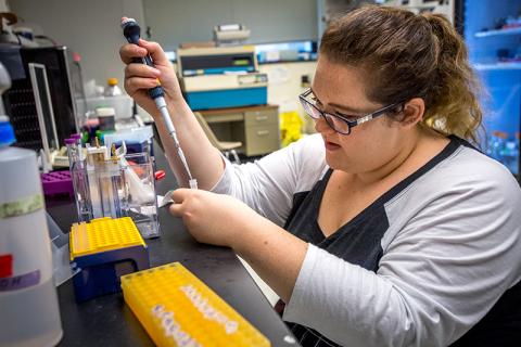 Tulane student Elizabeth Isabel, a rising junior majoring in neuroscience, transfers tau proteins into a gel in the lab of Anne Robinson, the Catherine and Henry Boh Professor of Engineering. The proteins will be studied to identify distinct behaviors that cause them to expire. Abnormal proteins destroy brain cells and lead to memory loss associated with Alzheimer’s disease.