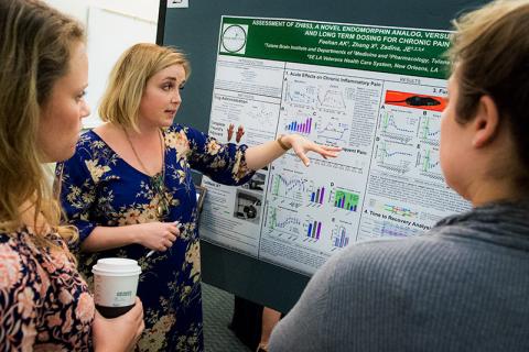 Amy Feehan, center, a fourth-year PhD candidate with the Tulane Brain Institute, answers questions about her research on treating chronic inflammatory pain during the 29th annual Health Sciences Research Days, which took place Monday and Tuesday at the J. Bennett Johnston building on the downtown campus. UPDATE: The day's winners are available here.