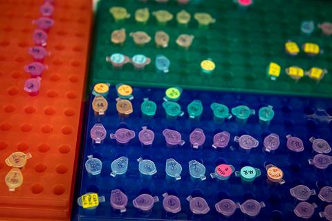 Tissue box September 19th, 2017 | Photo by Paula Burch-Celentano pburch@tulane.edu View PDF Small test tubes of processed tissue stand ready to be analyzed for genotyping in the lab of professor Fenglei He. The information will be used to verify cleft-lip abnormality in affected embryos compared to normal ones.